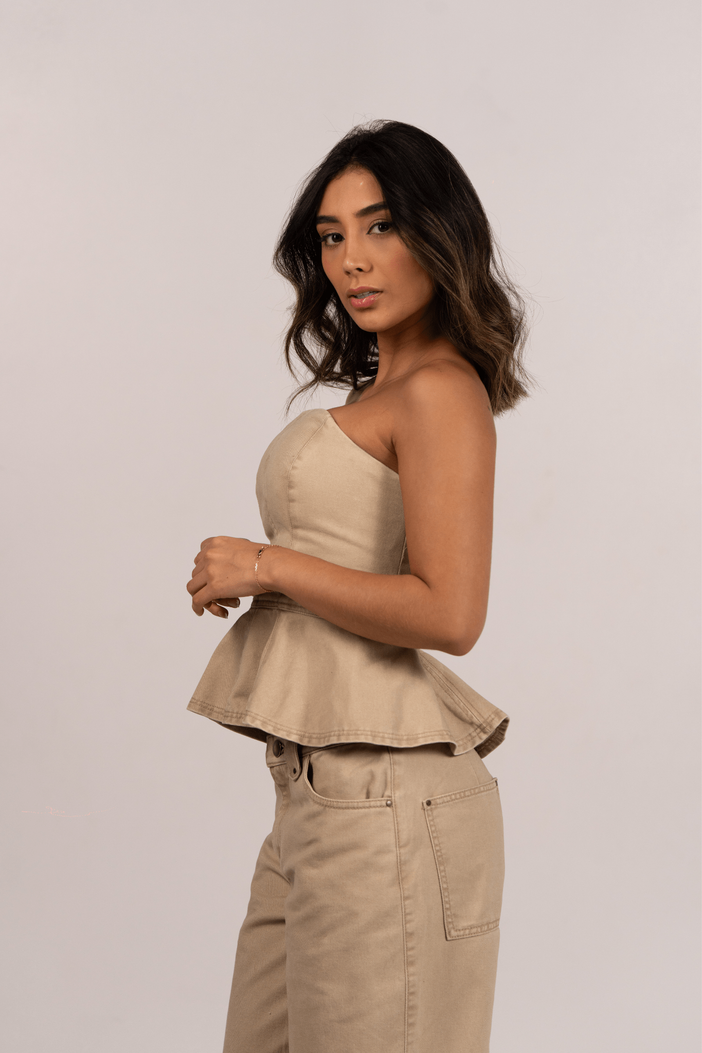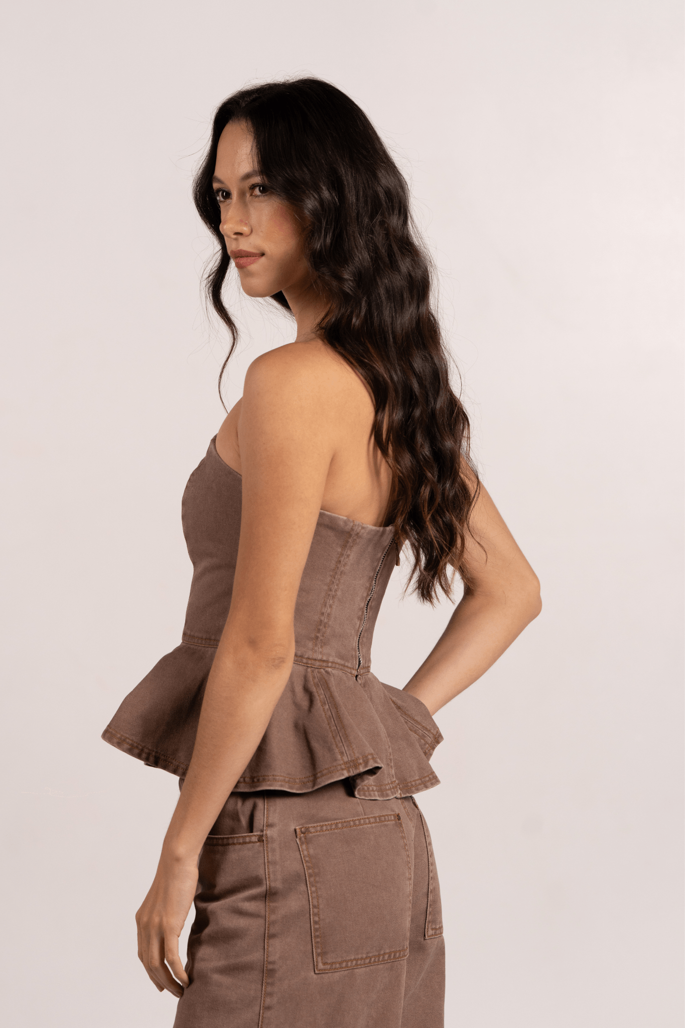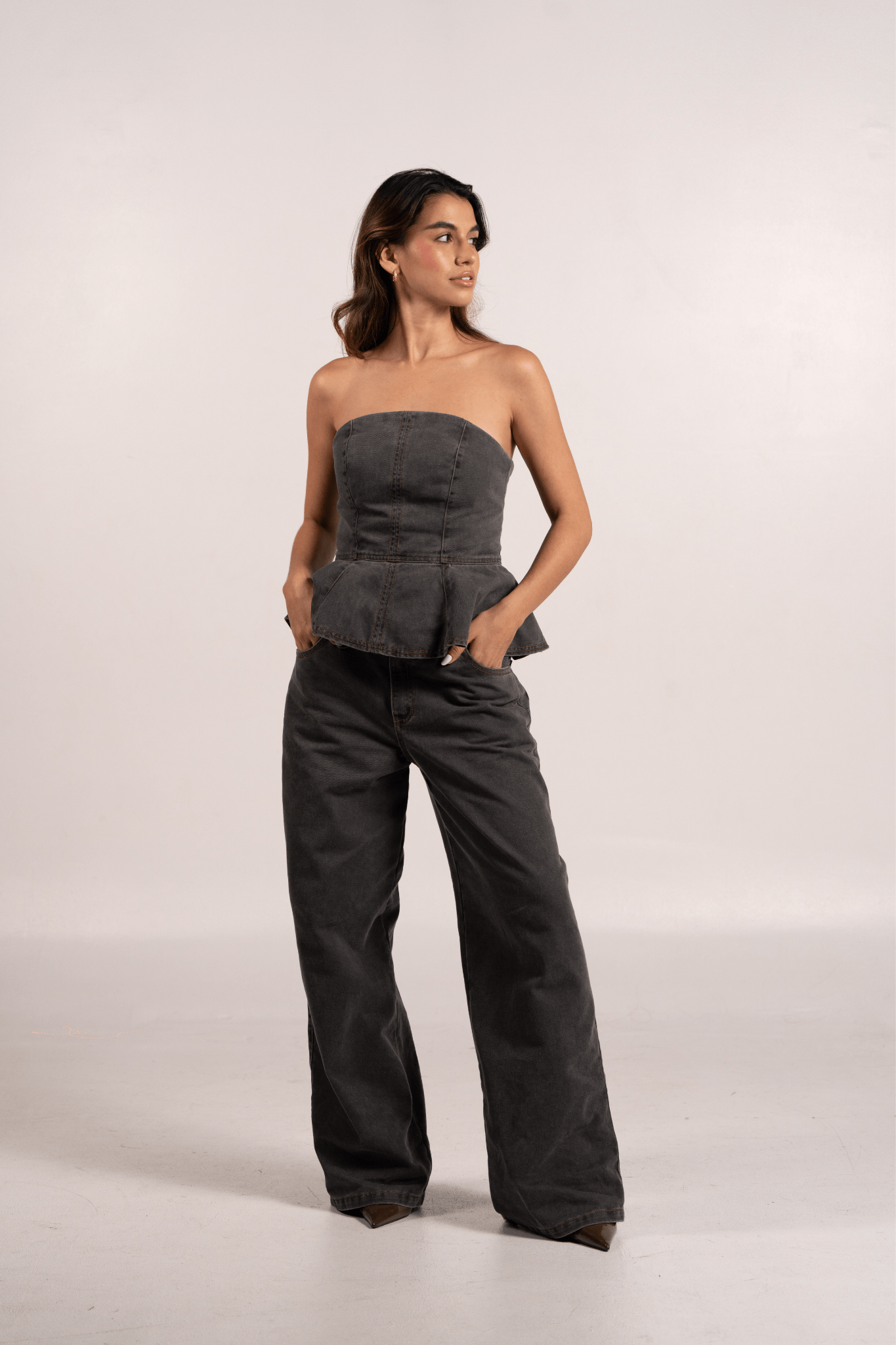 Set en denim con tonos hermosos y modernos, diseñado para resaltar la figura con una estructura impecable. El top strapless aporta definición y un toque sofisticado, mientras el pantalón de silueta amplia equilibra el look con comodidad y estilo. Un conjunto auténtico, versátil y perfecto para elevar cualquier outfit con un denim distinto y muy chic
